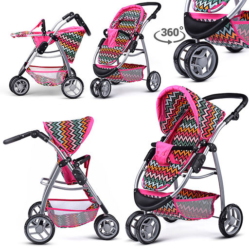 Коляска для кукол металлическая, прогулочная, цветные линии, зигзаг, цвет розово-голубой