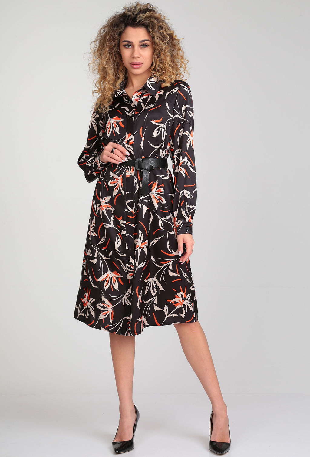Платье А-образного силуэта под пояс, без подкладки. Воротник рубашечного типа, планка с потайной застёжкой на петли пуговицы. В боковых швах карманы. Длинный рукав на манжете. В комплекте пояс из экокожи.