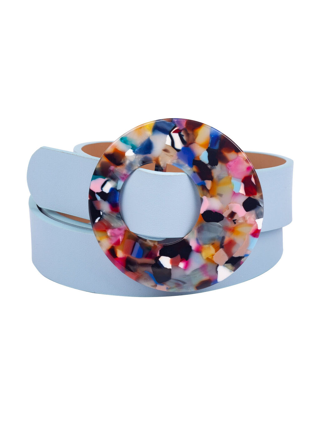 Стильный аксессуар голубого цвета из эко кожи с ассиметричной разноцветной пряжкой. Цвета застежки станут отличным стилистическим решением при выборе цветовой палитры, чтобы сделать образ законченным и гармоничным. Щелевая пряжка позволяет легко отрегулировать размер под любую фигуру.