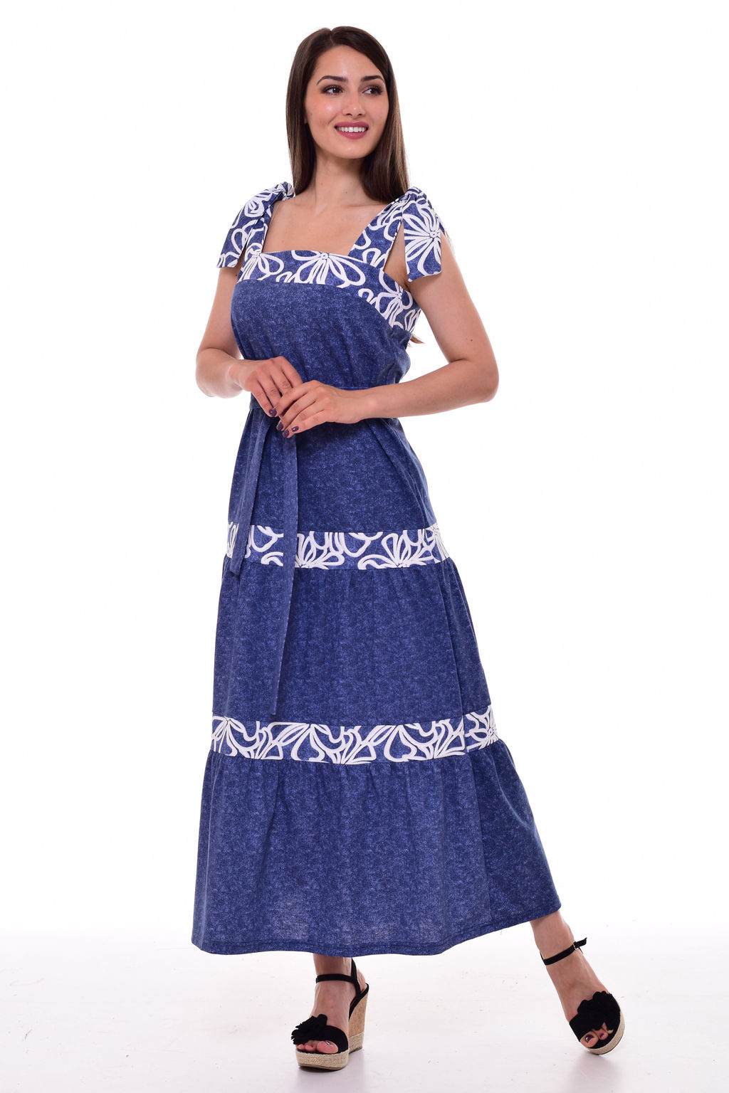 Длинный сарафан на бретелях-завязках, А-образный силуэт, сарафан состоит из ярусов, разделенных контрастной тканью, при желании сарафан можно приталить с помощью пояса. Длина от узла бретели до низа: 42-127 см, 44-127 см, 46-128 см, 48-128 см, 50-130 см, 52-130 см, 54-132 см, 56-132 см.