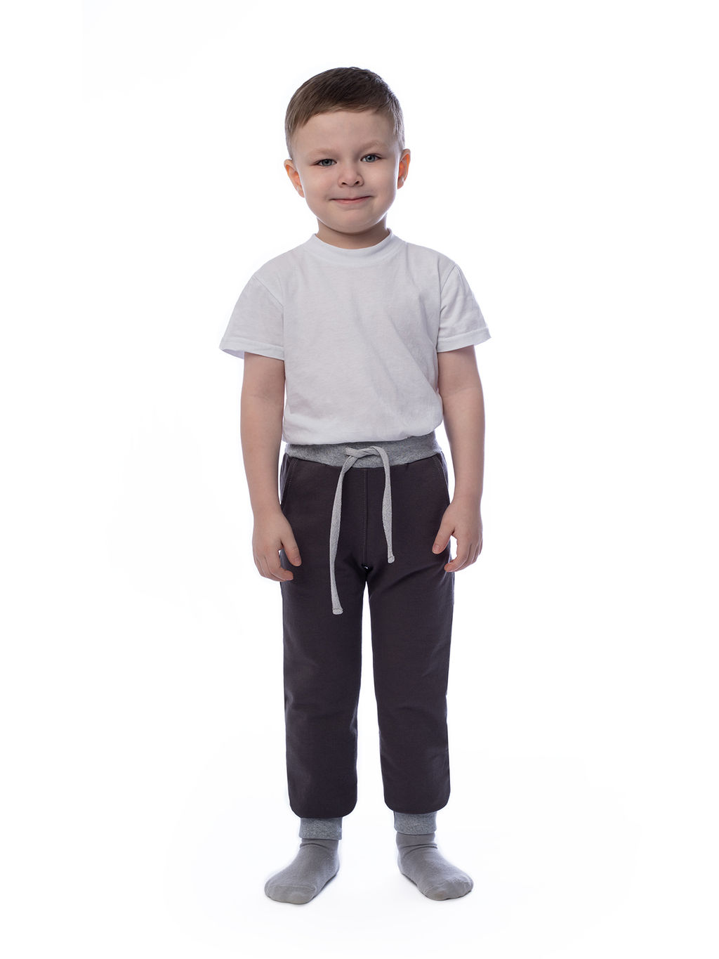 Практичные брюки серые свободного кроя не стеснят движений ребёнка. Модель выполнена из мягкого и плотного футера с добавлением лайкры. Брюки имеют трикотажный пояс со шнуром-утяжкой внутри и глубокие карманы по бокам. Низ штанин обработан эластичными манжетами.