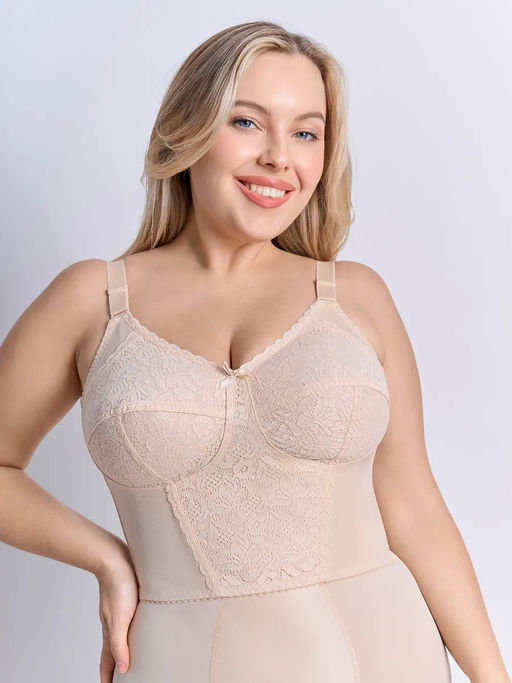 Полуграция без косточек Новое Время М039 функциональный корсетный бюстгальтер из сочетания эластичного трикотажного материала и изысканного кружевного полотна, идеально подходящий для больших размеров. Эта модель выполнена без каркасов, обеспечивая мягкое прилегание и комфорт. Чашки и передняя часть усилены подкладкой из плотного хлопка, что создаёт естественную поддержку и форму. Особые упругие пластины, встроенные в боковые швы, предотвращают скручивание ткани и способствуют устойчивости формы при носке. Благодаря конструктивным элементам и эластичности материалов, полуграция мягко корректирует фигуру, подчёркивая талию и сглаживая линии спины и живота для соблазнительного силуэта. Регулируемые эластичные бретели шириной 22,5 см (в зависимости от размера) обеспечивают удобство и оптимальное прилегание. Застежка состоит из трёх рядов с восемью крючками, что позволяет легко подобрать идеальную посадку и надёжную фиксацию.