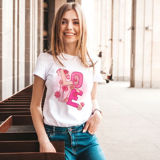 Каждый кристалл приклеивается вручную, что подтверждает прохождение 3-го этап контроля качества футболки и отсутствия производственного брака.