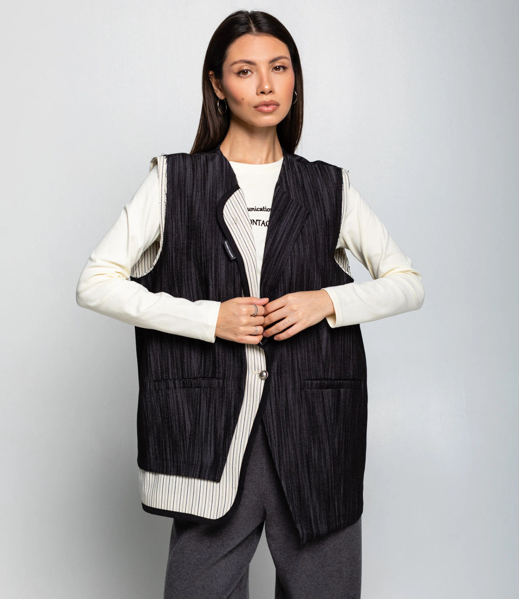 Жилет это одежда, которая подчеркивает привлекательность каждой женщины. Этот жилет выполнен из ткани, состоящей на 65% хлопок и 35% полиэстер. Классический безрукавный жилет прямого, слегка удлинённого силуэта, выполнен из ткани с выраженной тонкой вертикальной фактурой; модель двусторонняя, с контрастной внутренней отделкой, видимой по кромкам и внизу изделия, где создан эффект двойного края. Воротник отсутствует, линия горловины оформлена V?образным вырезом, плавно переходящим в невысокие лацканы, благодаря чему передняя часть выглядит как облегчённый пиджачный фасон; центральная застёжка представлена одной декоративной кнопкой чуть ниже груди, при этом жилет оставлен открытым для свободной посадки. По переду расположены два накладных кармана среднего размера, аккуратно вписанные в панель, с горизонтальной прострочкой у верхних краёв; боковые срезы обработаны без дополнительной отделки, что подчёркивает минимализм кроя! Рост 164, 83-61-89. Вы можете заказать онлайн презентацию на интересующие Вас модели. Наши менеджеры свяжутся с Вами и проведут индивидуальную видеотрансляцию, помогут составить заказ и ответят на Ваши вопросы. -- Характеристики -- Цвет: черный Пол: Женский Страна производитель: Китай Сезон: Демисезон Материал: Хлопок, Полиэстер