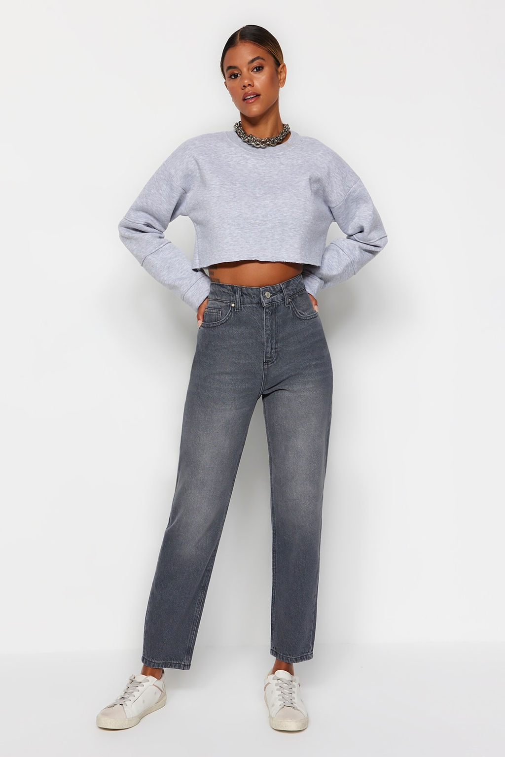 • Gri Yuksek Bel Mom %100 Pamuk Non-Stretch Jeans TWOAW24JE00076