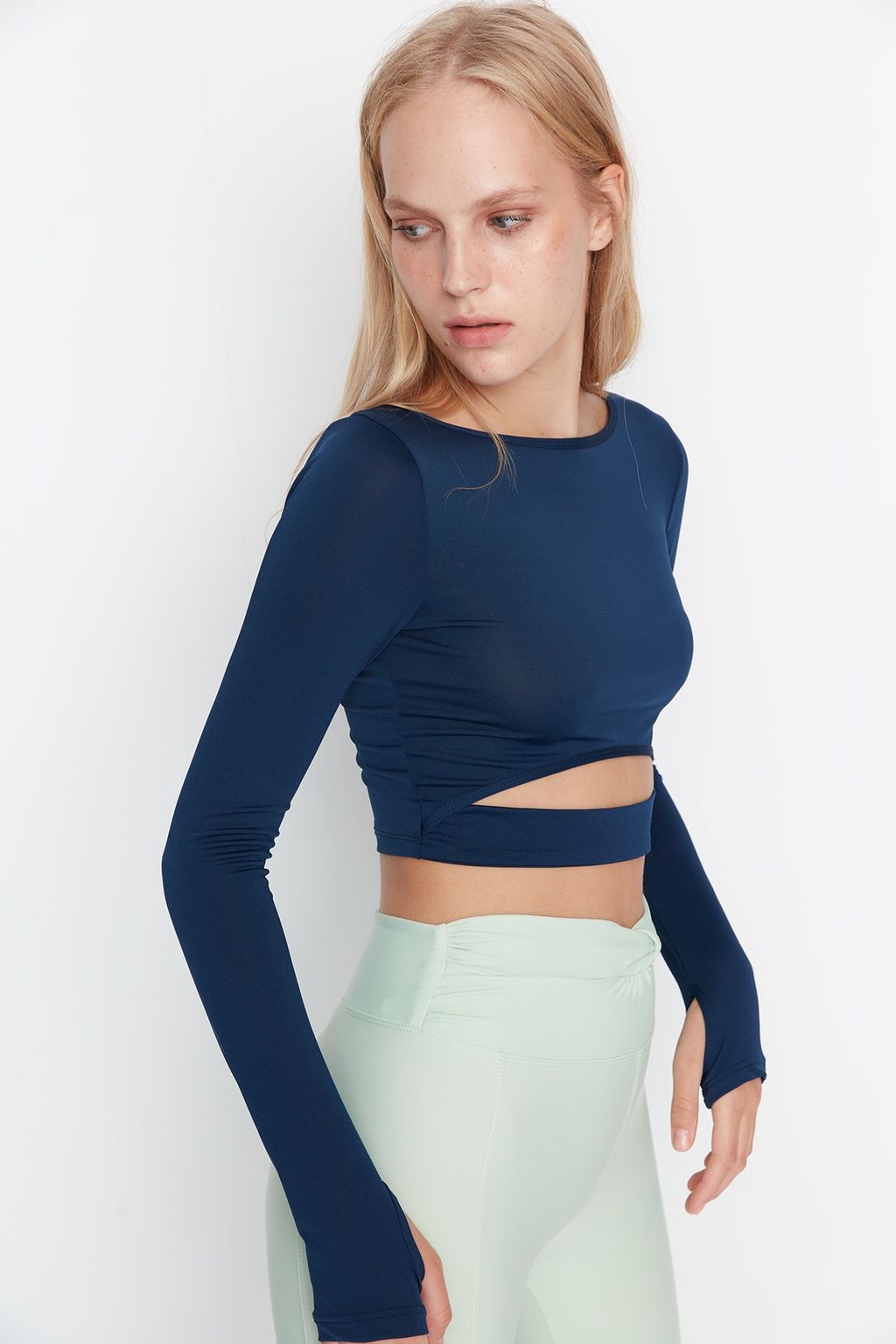 Koyu Lacivert Crop Pencere/Cut Out ve Bas Parmak Delik Detayl? Orme Spor Ust/Bluz TWOAW21BZ0156