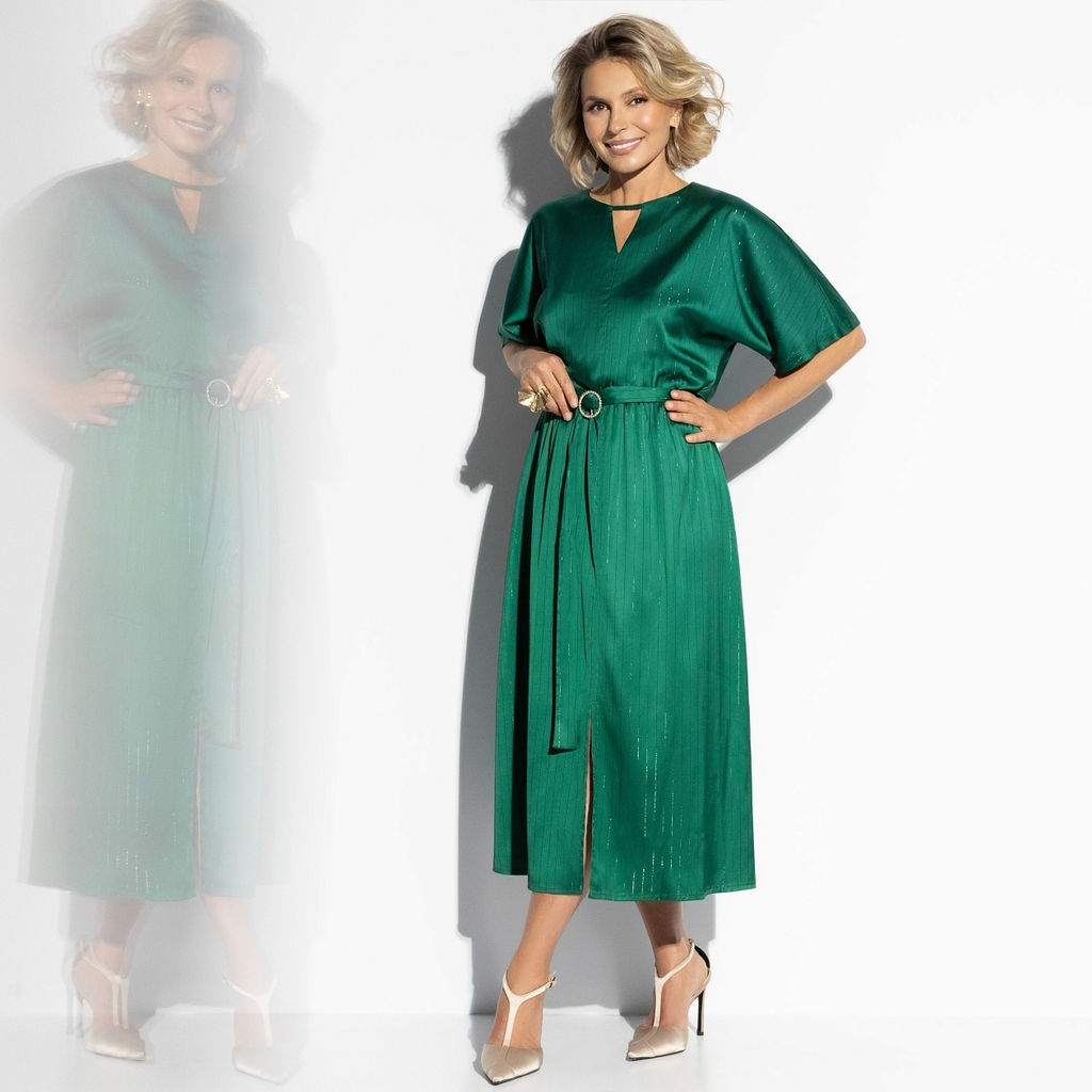 Говорят, изумруд притягивает удачу и исполняет самые заветные желания. В этом платье ЧАРУТТИ чувствуешь себя немного волшебницей, окутывая всех чарами своего обаяния. Пусть этот наряд станет твоим талисманом в Новом Году! Миди-платье из струящейся ткани изумрудного оттенка. Свободный верх, декоративный пояс на талии, эффектный разрез спереди. Ткань с легким блеском. Идеально для праздничных вечеров, когда хочется ловить взгляды.­