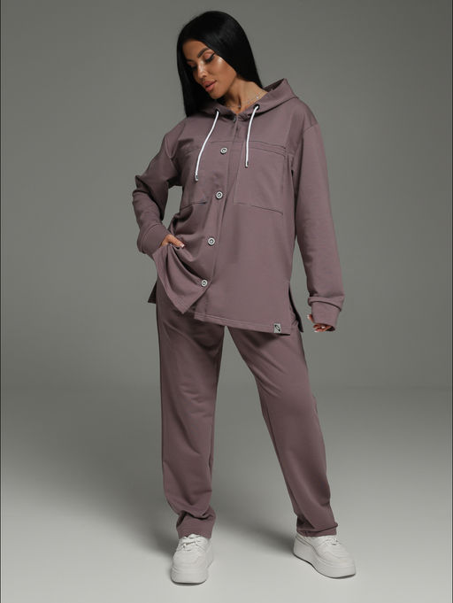 Представляем Вам наш костюм ПРЕСТИЖ,в стиле оверсайз,  состоящий из кофты с капюшоном и  на пуговицах и брюк с карманами. На полочке также находятся накладные карманы.