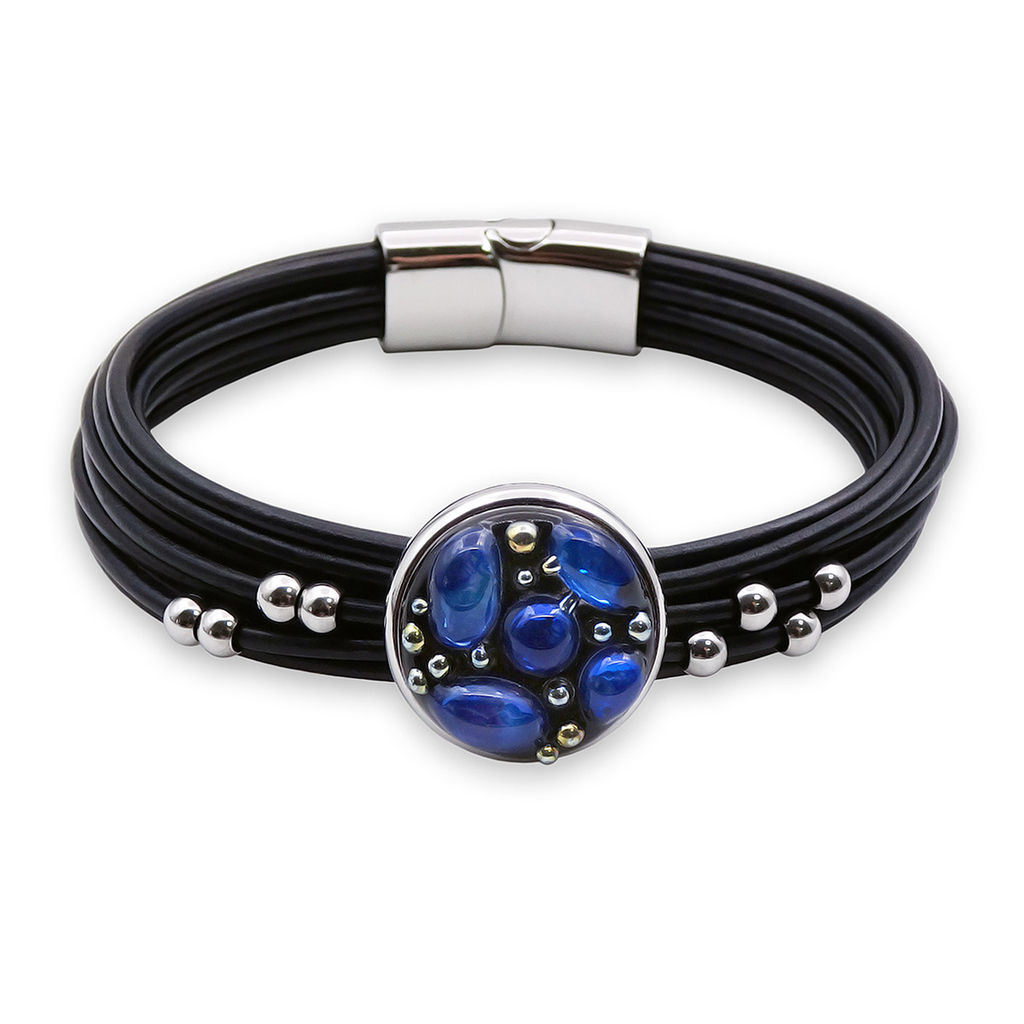 Браслет изготовлен из муранского стекла, натуральной кожи и гипоаллергенной ювелирной стали, что очень важно для людей с чувствительной кожей. Металл не темнеет и не подвергается воздействиям окружающей среды, надолго обеспечивая красивый внешний вид изделия. Крепкий магнитный замок с двойной защитой надежно фиксируется на запястье. Ширина браслета - 1,5 см. Диаметр стеклянного элемента - 2 см. Вес - 22 гр.