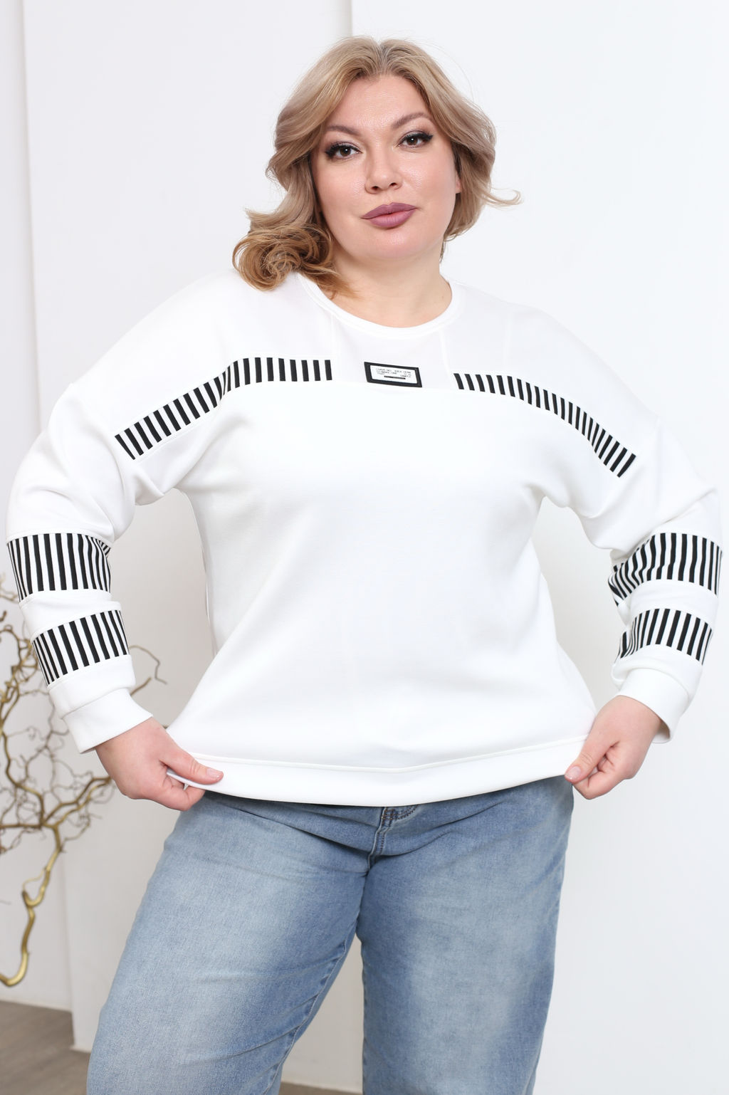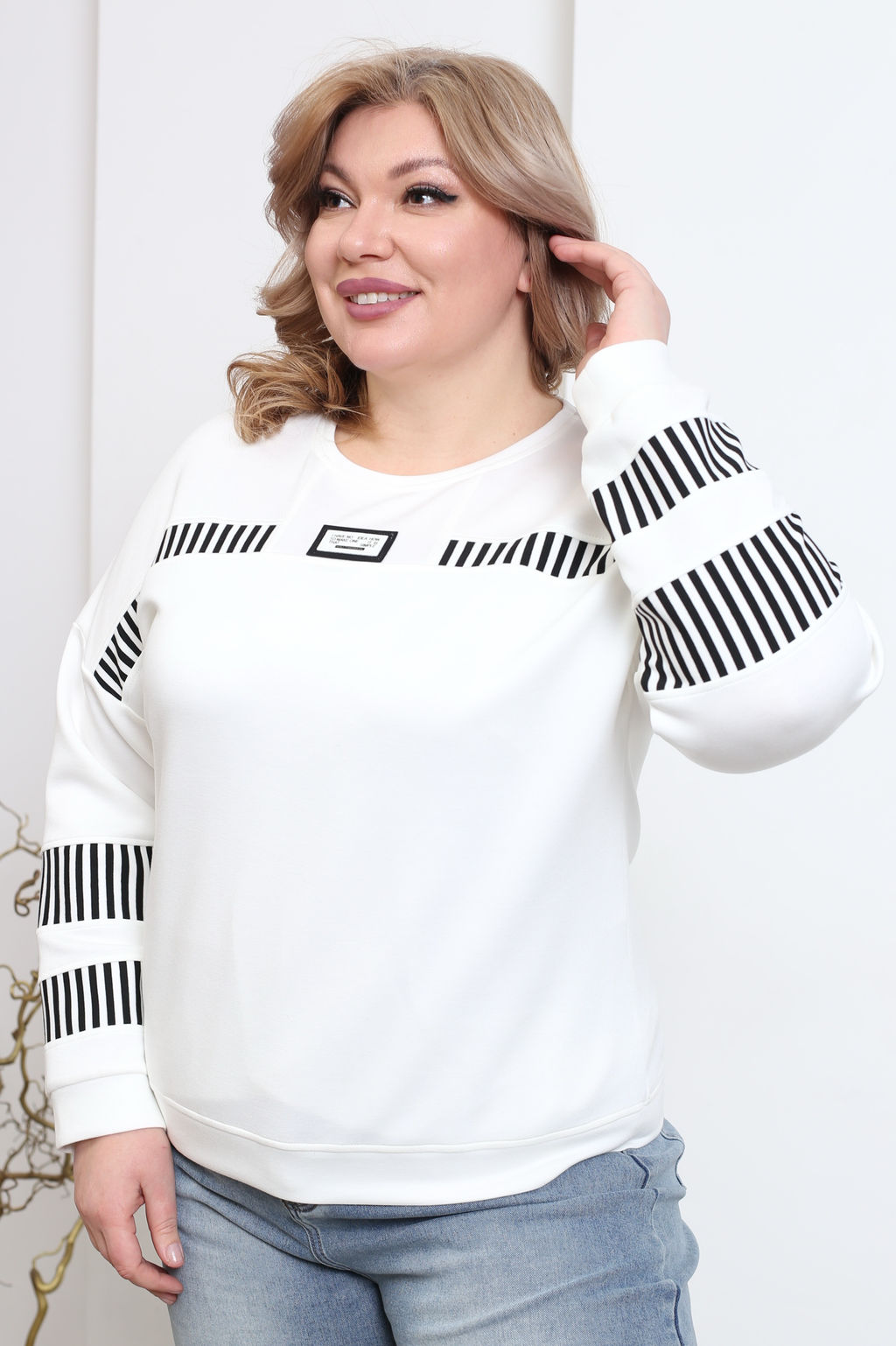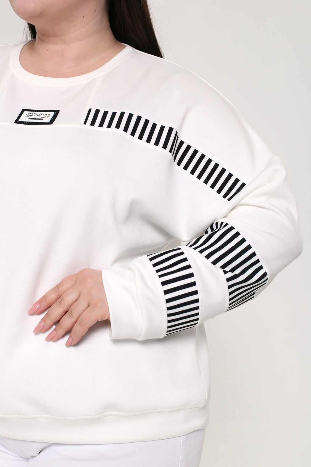 Стильный свитшот выполнена из мягкого трикотажа. Круглый вырез дополнен узким кантом, а приспущенные рукава полной длины присобраны на широкие манжеты. Контрастные полосатые вставки на груди и на рукавах  освежают образ и добавляют динамичности. Кофта свободного силуэта искусно обыгрывает фигуру и не сковывает движений. Модель отлично подойдёт для комбинирования с юбками, брюками, джинсами.­