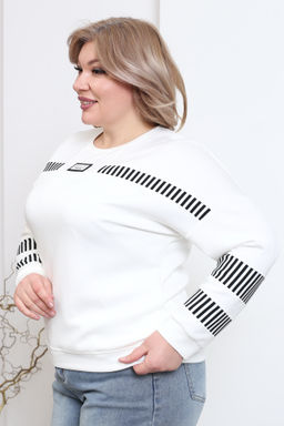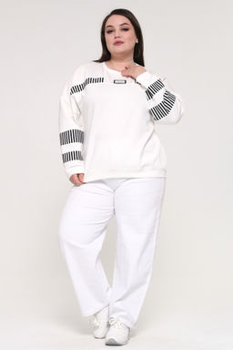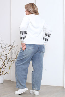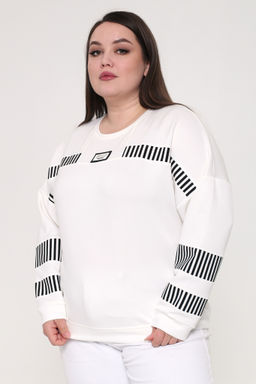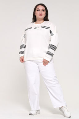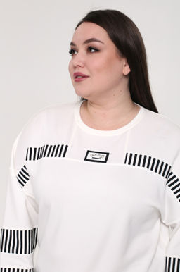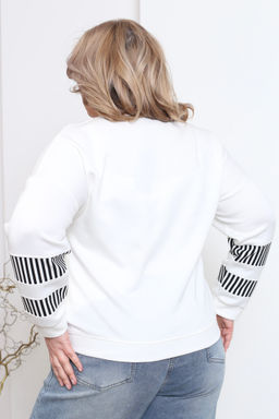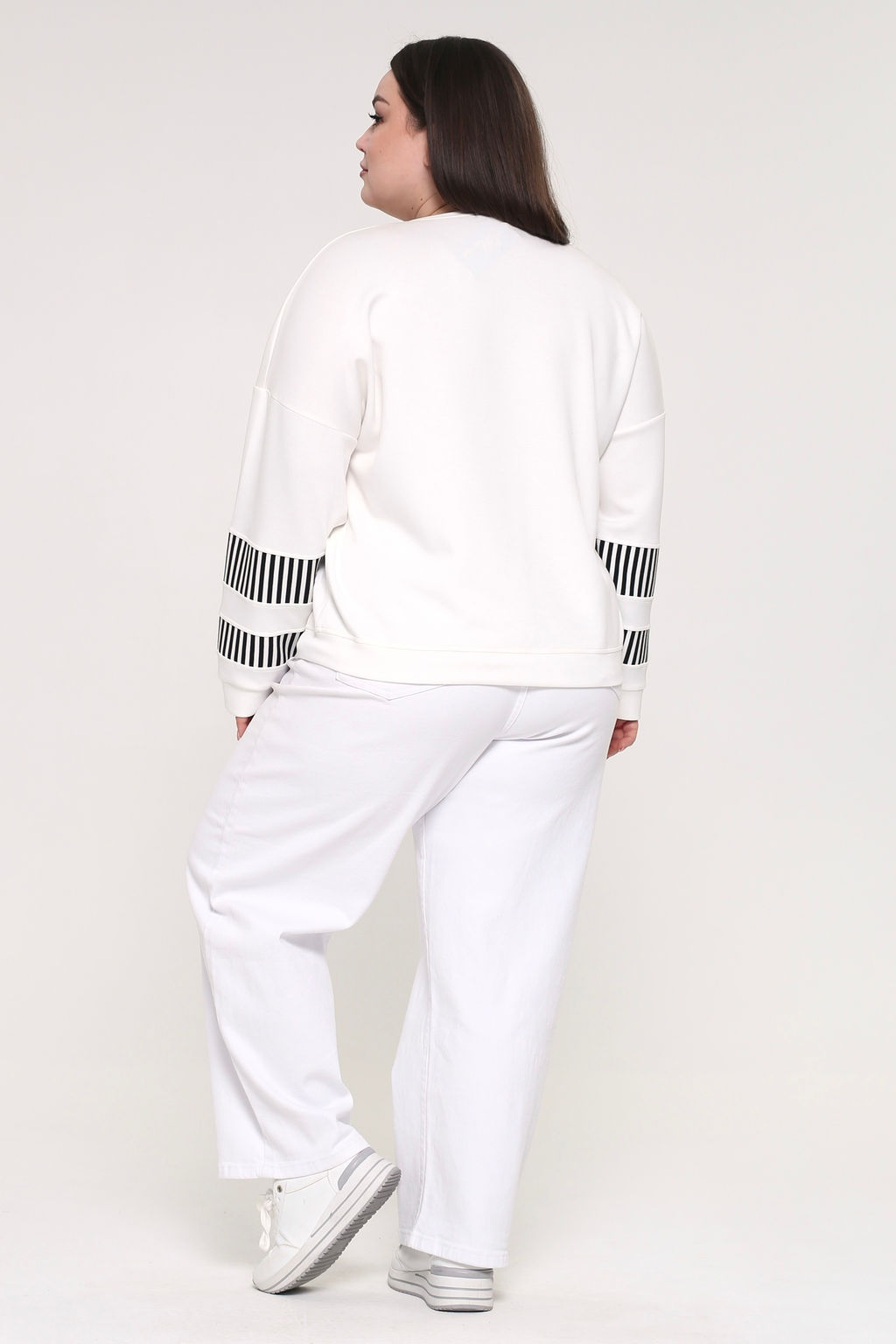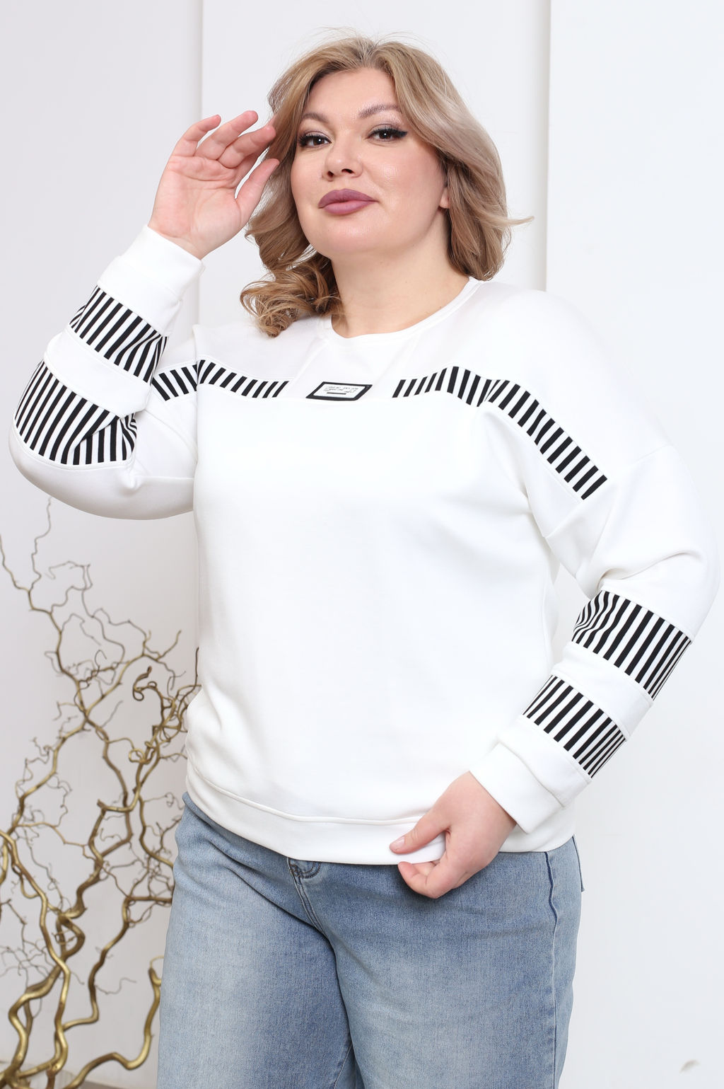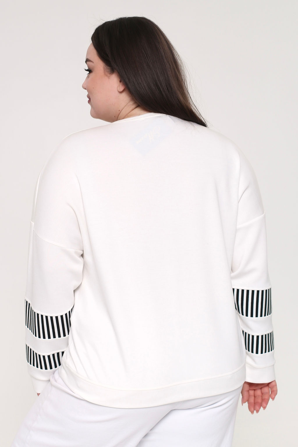Стильный свитшот выполнена из мягкого трикотажа. Круглый вырез дополнен узким кантом, а приспущенные рукава полной длины присобраны на широкие манжеты. Контрастные полосатые вставки на груди и на рукавах  освежают образ и добавляют динамичности. Кофта свободного силуэта искусно обыгрывает фигуру и не сковывает движений. Модель отлично подойдёт для комбинирования с юбками, брюками, джинсами.­