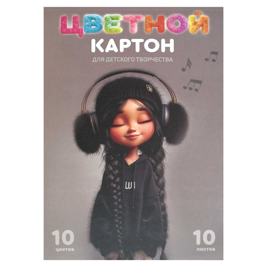 Цветной картон арт. 73193 ДЕВЧОНКА В НАУШНИКАХ /А4, клеевое скрепление, 10 л, (8 цветов+золото+серебро), обложка - полноцветная печать, мелованный картон с серым оборотом 230 г/м?, блок - мелованный картон с белым оборотом, 200 г/м?, 10 цветов, односторонняя печать /