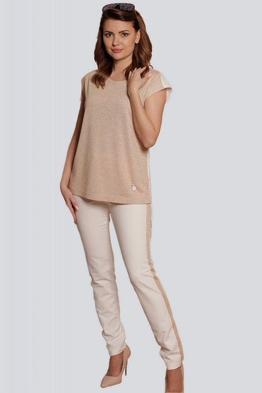 Блистать всегда и везде девиз этого года, который воплотить в жизнь поможет костюм с люрексом. Костюм, состоящий из блузона и брюк. Такой вариант обязательно оценят девушки, которые любят привлекать к себе внимание. Еще в том году, брюки с лампасами были в новинку, а в этом сезоне они стали частым гостем в повседневных образах. В них кроется особая прелесть, наверное, потому что они позволяют привычным вещам играть по-новому, более интересно. Вертикальные полоски отлично удлиняют силуэт, а это еще один плюс в копилку этой модной вещи. Состав трикотажа: 75% хлопок, 20% полиэстер, 5% спандекс.­