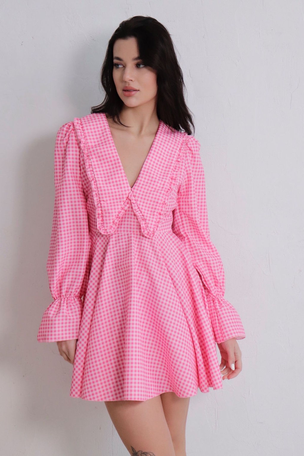 Романтичное платье в клетку Виши. Платье отрезное по талии, с расклешённой юбкой. Глубокий V-образный вырез украшает большой воротник с рюшами. Рукава широкие и длинные, со сборкой у запястья.