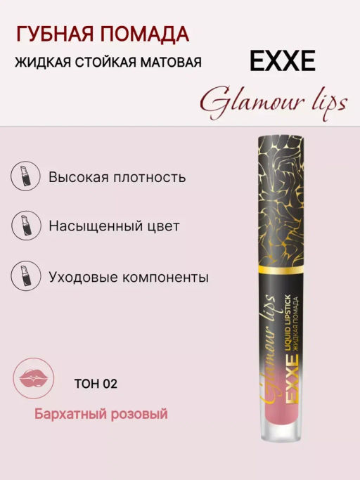 Губная помада EXXE Glamour Lips 02 Бархатный розовый - это жидкое косметическое средство, созданное для придания губам нежного и стойкого оттенка.