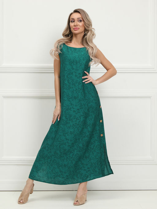 Эффектное платье прямого силуэта из текстильной ткани зеленого цвета. Круглый вырез изделия и проймы рукавов обработаны окантовкой. По бокам изделия планка украшенная пуговицами. Платье дополнено разрезами по бокам. Длина изделия по спинке от плечевого шва до низа изделия - 123 см. Рост фотомодели - 170 см.