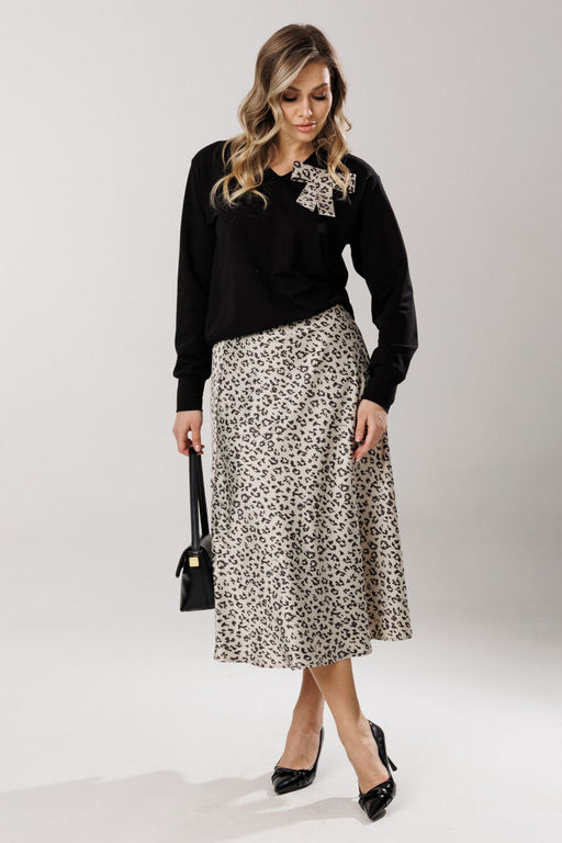 Состав: Джемпер: Хлопок-95%; Эластан-5%; Юбка: Вискоза-30%; ПЭ-68%; Эластан-2%; Элегантный комплект, состоящий из блузона и удлиненной юбки с расклешением. Блузон из уютного трикотажного полотна, свободного прямого силуэта. Линия плеча чуть спущена, рукав прямой, на зауженной манжете. Длина рукава, вместе с плечевой линией 78 см. Из них 13 см: длина плеча и 65 см: длина рукава с напуском. Высота манжета 8 см. Горловина оформлена угловым вырезом на обтачном элементе. Низ блузона оканчивается притачной манжетой-поясом, высотой 7,5 см. Длина блузона по спинке изделия 61 см. Юбка А-силуэта, с умеренным расклешением, удлиненная, на подкладке. В боковом шве изделия расположена застежка: потайная молния. Линия талии обработана внутренним обтачным поясом. Длина юбки 82 см. Декоративным дополнением к комплекту выступает съемная текстильная брошь в виде стилизованного банта. (фурнитура может отличаться от представленной на рекламном фотоматериале) Особые рекомендации: рекомендуется холодная деликатная ручная стирка, без использования отбеливающих СМС, без интенсивного трения. Сушка в вертикальном положении. ВТО с минимальным паром. -- Характеристики -- Состав: Джемпер- Хлопок-95%; Эластан-5%; Юбка- Вискоза-30%; ПЭ-68%; Эластан-2%; Сезон: Весна Рост: 164 Страна бренда: Беларусь