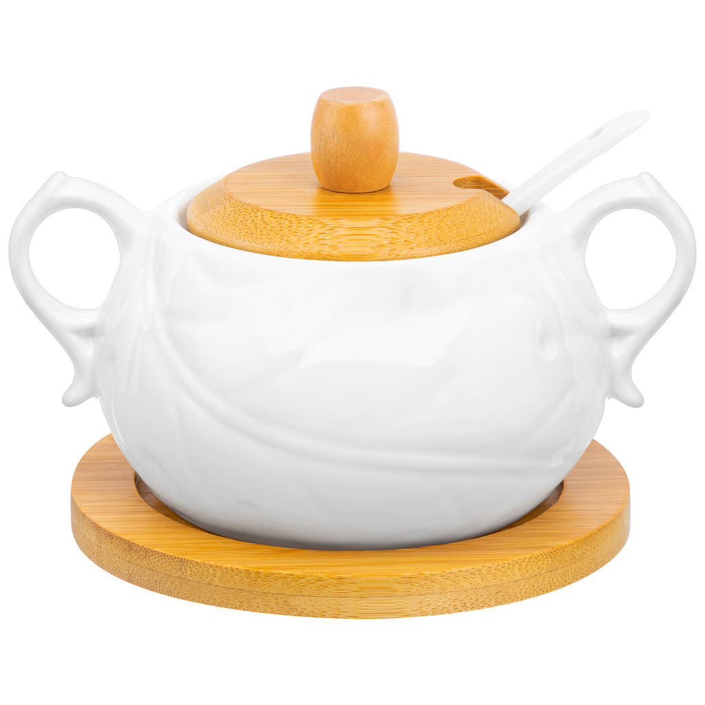• Сахарница 400 мл 14,5*11*9 см "Айсберг" с ложкой, с дер. крышкой на дер. подставке, фарфор