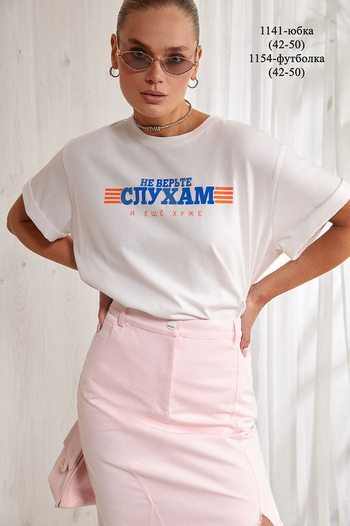Футболка оверсайз выполнена из плотного хлопкового трикотажного полотна( интерлок). Спущенная линия плеча. Короткий рукав. Горловина круглая с притачной планкой. Дизайнерский принт “Не верьте слухам..” (выполнен флоком) на передней половинке футболки.