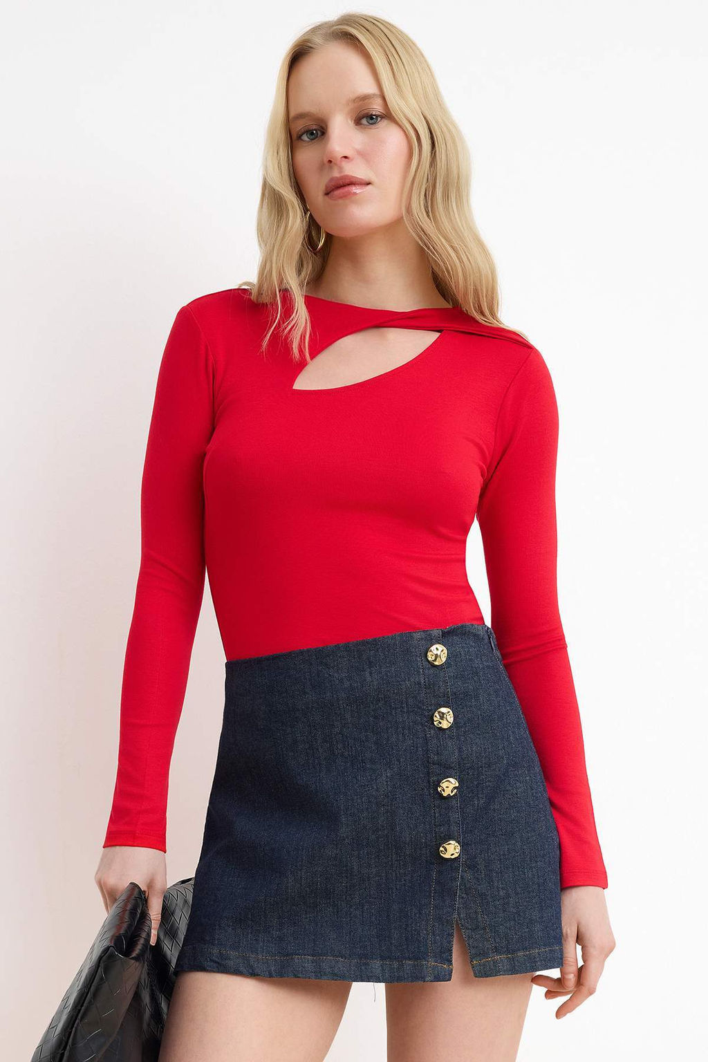 K?rm?z? Duz Fitted Bisiklet Yaka Standart Kol Uzun Premium Yumusak Orme Bluz TWOSS26BZ00247