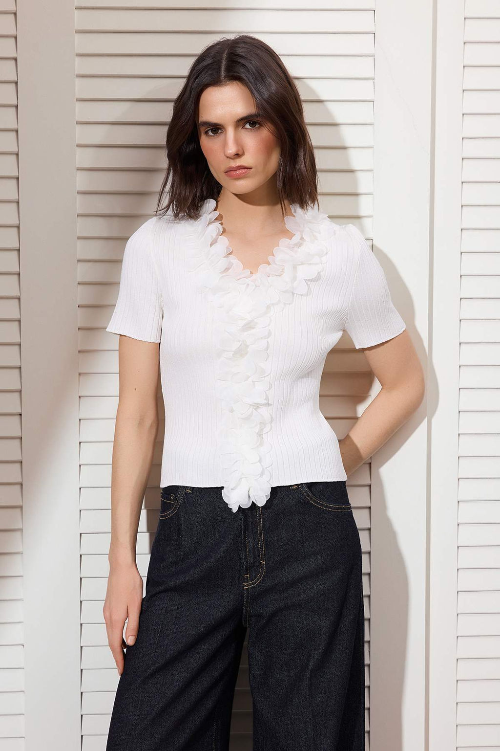 • Ekru Tul Cicek V Yaka Detayl? Triko Bluz TWOSS26BZ00114