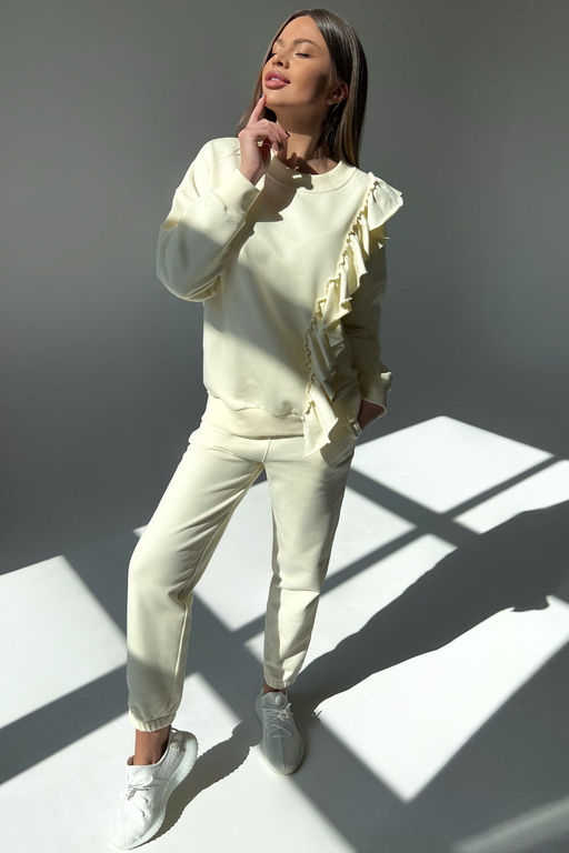 Состав: ПЭ-20%; Хлопок-80%; Современный, женственный костюм, покроя oversize из комфортной ткани (футера пенье). Костюм состоит из джоггеров и свободного свитшота с воланом. Волан с необработанным краем (укреплён строчкой для надежности) пришит асимметрично на левой стороне изделия. Свитшот имеет спущенную линию плеча, прямой силуэт и притачную манжету по низу изделия. По центру переда вышивка логотип в цвет ткани. Рукава с притачной по низу манжетой. Бейка горловины, низ изделия и манжеты рукавов выполнены из ткани - компаньона кошкорсе. Брюки с притачным поясом, резинкой внутри. Передняя половинка брюк с удобными боковыми карманами. Низ брюк присобран на резинку. Длина свитшота по спинке 70-73 см. Длина рукава от горловины 72-74 см для роста 164-170 см, 74-76 см для роста 170-176 см. Полуобхват груди в свитшоте: 42 р. - 69 см, 44 р. - 71 см, 46 р. - 73 см, 48 р. - 75 см, 50 р. 77 см, 52 р. 79 см. Длина брюк по боковому шву с поясом: 99-102 см для роста 164-170 см, 102-104 см для роста 170-176 см. Полуобхват бедер: 42 р. - 49 см, 44 р. - 51 см, 46 р. - 53 см, 48 р. - 55 см, 50 р. 57 см, 52 р. 59 см. -- Характеристики -- Состав: ПЭ-20%; Хлопок-80%; Сезон: Лето Рост: 164 Страна бренда: Беларусь