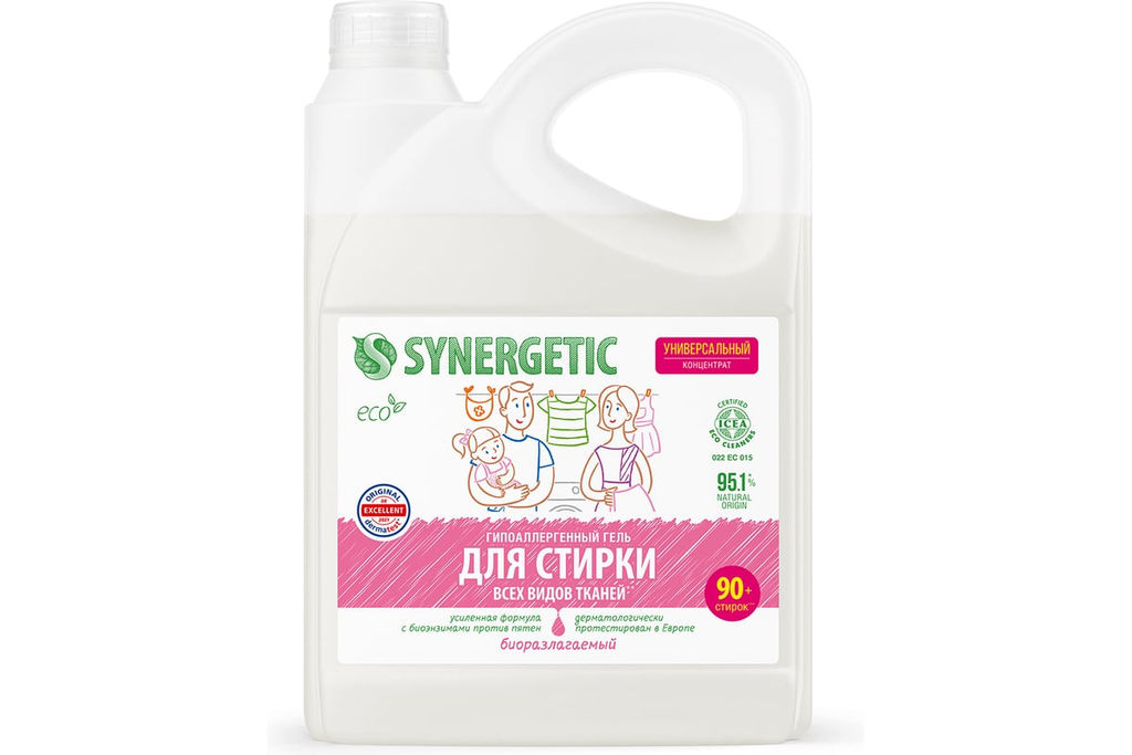 Универсальный гель для стирки белья SYNERGETIC канистра ПЭ 2.75 л 4623722441836 109275 предназначен для стирки всех видов тканей, кроме деликатных, в стиральных машинах любого типа и ручной стирки при температуре 20-90 C. Уникальный комплекс растительных тензидов, натурального мыла и зелёных хелатов обеспечивает бережное и эффективное очищение тканей. Функциональные добавки предотвращают повторное оседание загрязнений на ткани, сохраняя её первоначальный вид, прочность и структуру. Эффективность подтверждена протоколом испытаний №18/000550675 от 19.11.2018 г. Международный экологический сертификат ICEA подтверждает биоразлагаемость, безопасность и эффективность средства. Гель не содержит красителей, фосфатов, фосфонатов, ЭДТА и агрессивных ПАВ. Полностью выполаскивается из тканей. Дерматологически протестирован в Европе (протокол испытаний №18/000505341 от 22.11.2018 г.). Биоразлагаемые компоненты не вредят микрофлоре септических установок