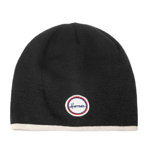 Вязаная шапка бини с круглым логотипом. EDMOND 026 аксессуар черного цвета. Белая контрастная линия дополняет низ шапки. Сбоку головной убор украшает круглая нашивка с логотипом бренда Herman. Сшита в Бельгии.