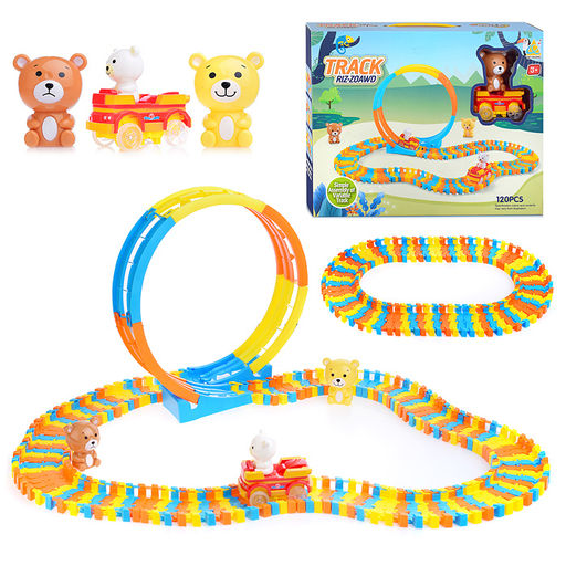 В комплекте: машинка, три медвежонка, 120 элементов для сборки дороги, трюковое колесо из семи частей.