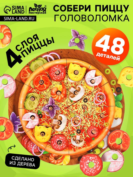 Уверяем, такого вы ещё не видели: пирамидка "Пицца"!Самая нижняя деталь - это поднос для пиццы, который разделён на несколько частей. Положив один кусок теста пиццы, скажите ребёнку, что это 1/6. Подобным способом объясните, что такое 1/3, 1/2.Второсй слой - соус. Отверстия в деталях нужно совместить со штырьками. Привычный принцип сбора пирамидки усложняется за счёт совмещения трёх отверстий.Каждый кусочек третьего слоя пиццы (сыр и начинка) разделён ещё на три части. Чтобы составить цельный кусок, необходимо собрать три детали.Теперь вы можете размещать отдельные детали начинки: грибы, помидоры и пр. Попросите ребёнка назвать каждую деталь и посчитать количество. Для кого: Унисекс. Возраст: От 3 лет. Длина собранного пазла, см: 21. Ширина собранного пазла, см: 21. Количество элементов: 48. Тематика: Еда. Тематика праздника: Универсальная тематика. Возраст: Детский. Жанр игры: Детская игра. Развитие навыков: Счёт. Развитие навыков: Воображение. Развитие навыков: Моторика. Сложность головоломки: 3. Тема обучения: Цифры, счёт, математика. Вид пирамидки: Логическая. Тип пазлов: Головоломки. Форма: Круг. Особенности: В рамке. Бесплатная доставка: Да. Наша разработка: Да.