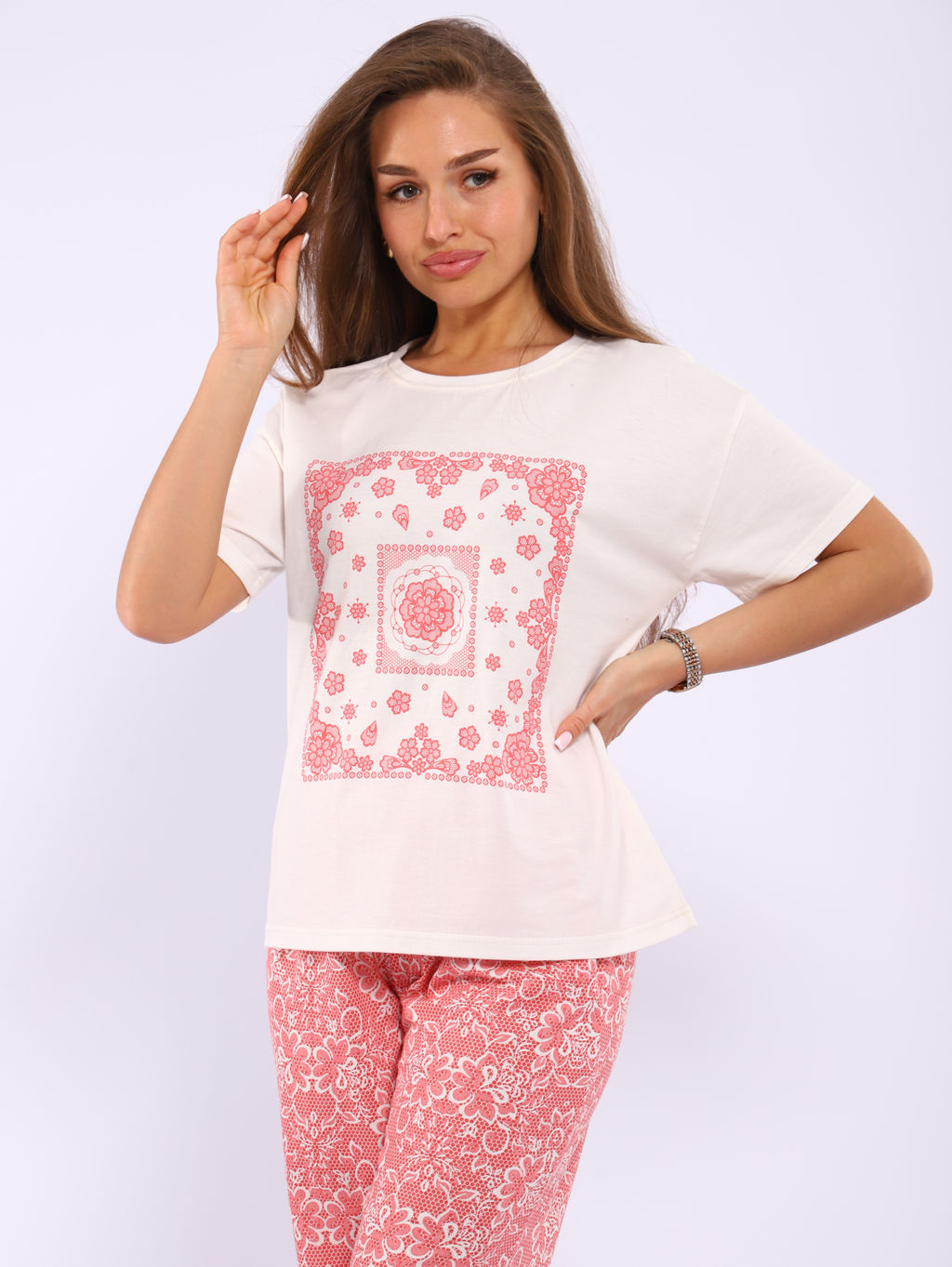 Состав: 100%-хлопок Женская хлопковая пижама свободного кроя оверсайз, футболка скоротким рукавом, круглая горловина. Брюки палаццо, пояс на резинке. Стильная пижама при желании станет домашним любимым костюмом. Длина футболки: 42-62,44-62,46-63,48-64,50-65,52-65,54-66,56-66. Обхват груди: 42-48,44-50,46-52,48-54,50-56,52-58,54-60,56-62. Ширина внизу: 42-52,44-54,46-56,48-58,50-60,52-62,54-64,56-66. Длина рукава с плечом: 42-30,44-32,46-33,48-34,50-35,52-36,54-38,56-40. Длина брюк: 42-107,44-107,46-108,48-108,50-108,52-109,54-109,56-109. Обхват бедра: 42-54,44-56,46-58,48-60,50-62,52-64,54-66,56-68. Обхват талии: 42-44,44-46,46-48,48-50,50-52,52-54,54-56,56-58. Ширина внизу: 42-26,44-27,46-28,48-23,50-30,52-32,54-33,56-34.