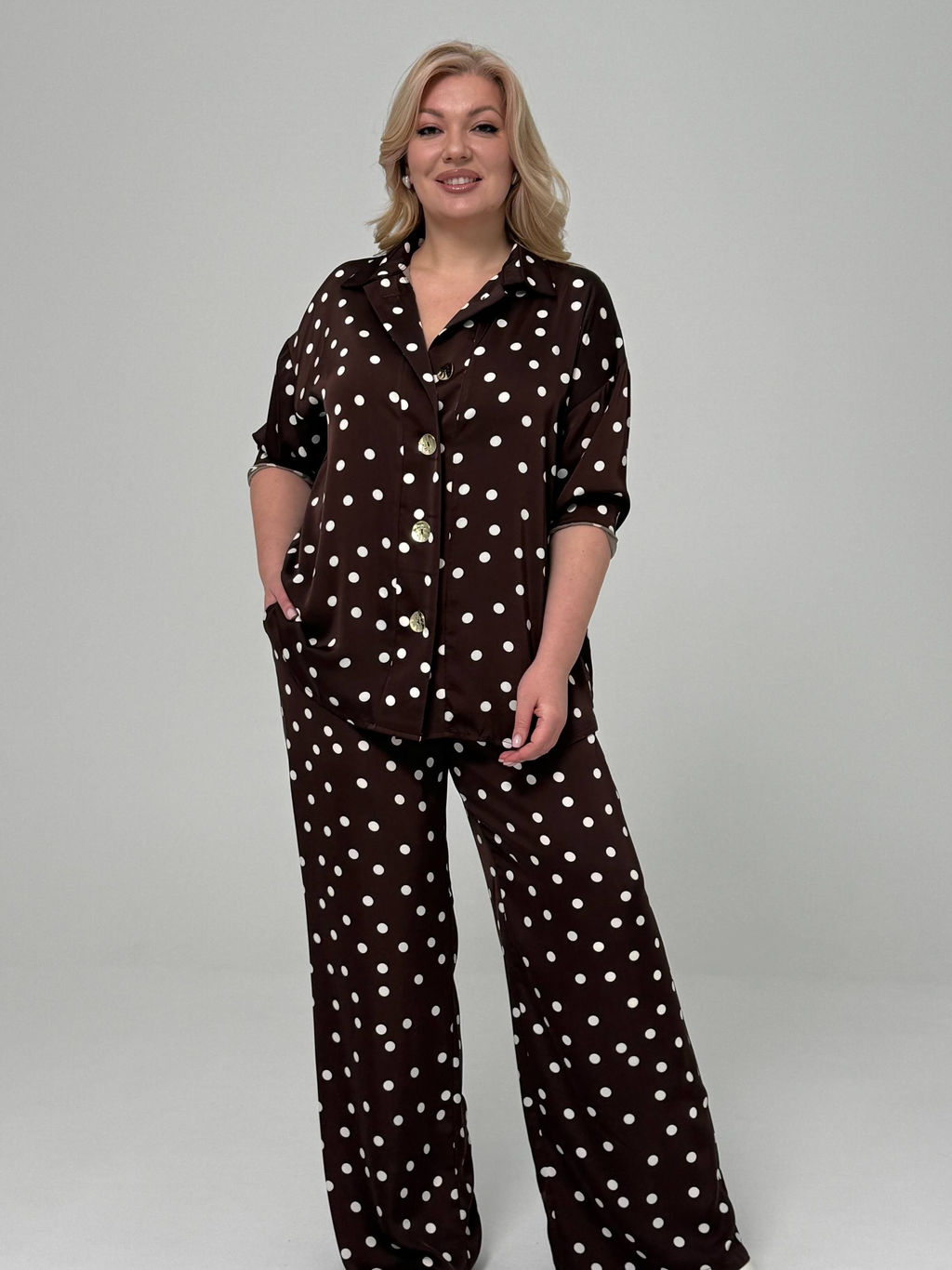 Костюм брючный в горох с пуговицами коричневый­