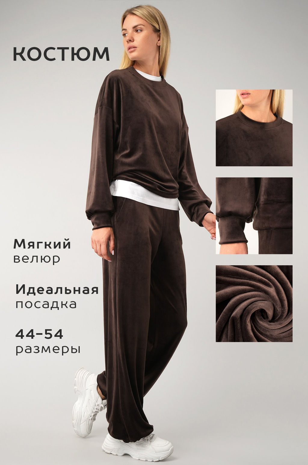 Повседневный велюровый костюм с брюками имеет свободный прямой крой и удобен для дома и прогулок. Бархатный костюм подойдет для путешествий и домашнего уюта. Коричневый костюм идеален для осенних и весенних образов.