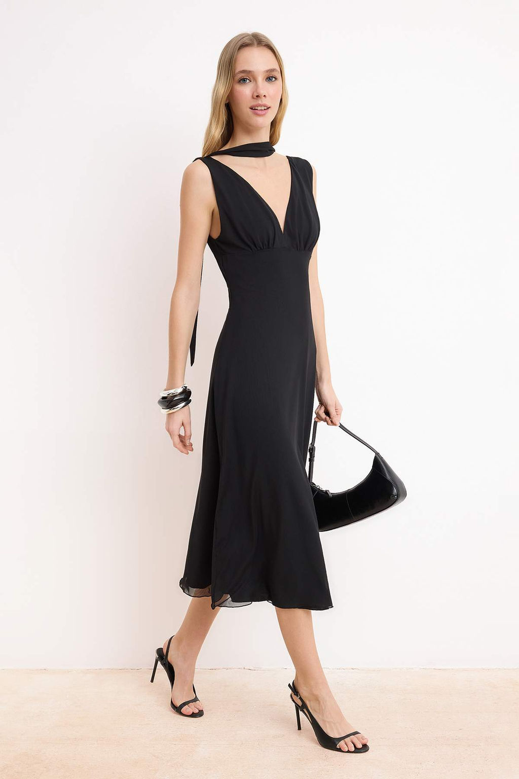 • Siyah Animal A-Kesim/Can Form Kruvaze Kolsuz Buzgulu Maxi Tul Orme Elbise TWOSS26EL00208
