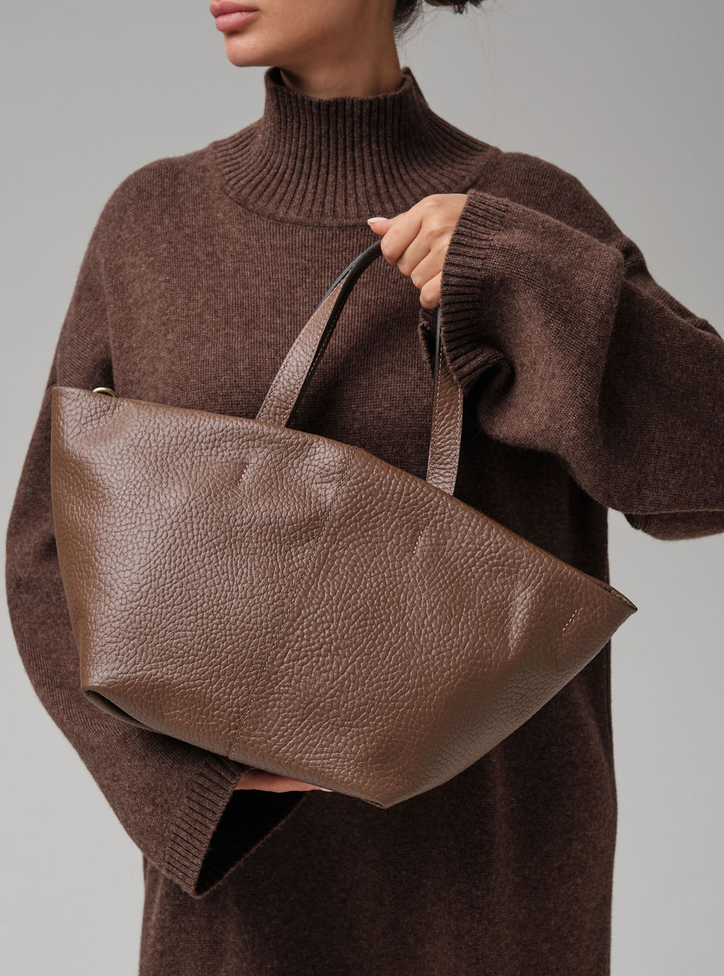 Элегантная сумка-тоут Azaro 31355 коричневый какао соло из высококачественной натуральной зернистой кожи теплого коричнево-шоколадного оттенка. Детали: натуральная зернистая кожа, 2 ручки, съемный плечевой ремень в комплекте, 1 внутреннее отделение, хлопковая водонепроницаемая подкладка, 1 внутренний закрытый карман на молнии, 1 внутренний открытый карман, съемный кожаный подвес с логотипом бренда. Текстурированная поверхность кожи придаёт аксессуару особый шарм и подчёркивает его премиальность. Трапециевидная, слегка расклёшенная форма с мягкими линиями сочетает в себе лаконичность и практичность. Минималистичный стиль без лишнего декора универсален для разных образов. Две широкие кожаные ручки удобны для ношения в руке или на предплечье, хорошо прошиты и выдерживают значительный вес. Дополнительный длинный регулируемый плечевой ремень позволяет трансформировать сумку в модель кросс-боди, которую удобно носить через плечо, освобождая руки. Вместительное внутреннее отделение на хлопковой водонепроницаемой подкладке позволяет разместить все необходимые вещи. Женская кожаная сумка Azaro 31355 коричневый какао станет незаменимой частью гардероба, сочетая в себе функциональность и элегантность. -- Характеристики -- Тип товара: Женские сумки Цвет: коричневый какао Материал: Натуральная кожа Бренд: Azaro Тип: Сумка с ручками, Сумка через плечо Страна-изготовитель: Россия Высота, см: 24 Ширина, см: 47 Глубина, см: 18 Материал подкладки: Хлопок Количество внутренних отделений: 1 Тип застежки: Молния Высота ручек, см: 16 Длина плечевого ремня, см: 116 Ручки: На локоть, Плечевой ремень Пол: женская коллекция Группа товара: Сумки Выгружать товары на сайт: Да Количество внутренних карманов, шт: 2