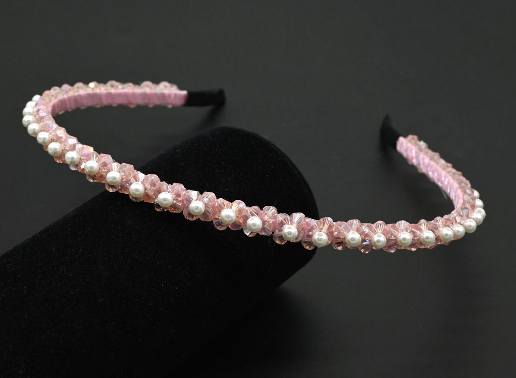 Тонкий ободок для волос украшенный цирконами в ювелирной огранке и майоркой.