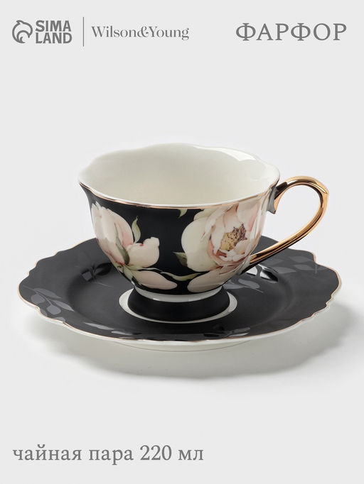 Почувствуйте изысканность в каждой детали с этой великолепной чёрной чайной парой из фарфора, украшенной утончённым цветочным рисунком.