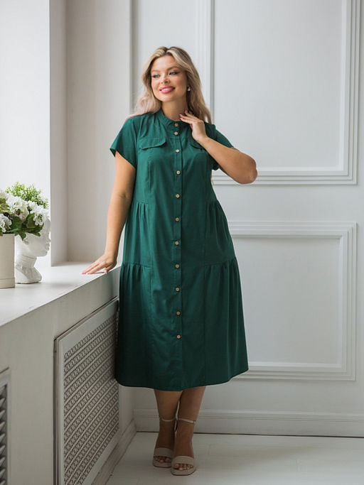 Удобное повседневное платье с двумя ярусами, свободного силуэта, выполнено из неэластичной плательной ткани. Перед платья с отрезными кокетками с фигурными клапанами в швах притачивания кокеток. Платье с центральной застежкой на петли и пуговицы и двумя рельефными швами по переду. Горловина переда и спинки с втачным воротником-стойкой. Рукав втачной короткий. Длина рукава от плеча в 46 р-ре 13 см. в 62 р-ре 17 см., ширина рукава по низу в 46 р-ре 38 см. в 62 р-ре 50 см. Платье без подклада. Длина изделия по спинке в 46 р-ре 114 см. в 62 р-ре 121 см.