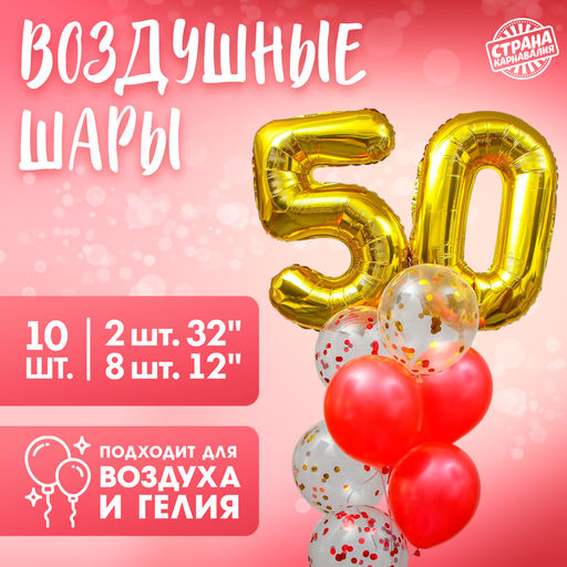 В наборе, шт.: 10. Диаметр, дюйм: 12. Диаметр, дюйм: 30. Тематика праздника: День рождения. Тематика рисунка: Без рисунка. Тематика рисунка: День Рождения. Вид шара: Цифра. Вид шара: Классический. Вид шара: С наполнением. Вид шара: Готовые наборы. Цифра: 50. Надувка шара: Гелием. Надувка шара: Воздухом. Составляющие набора: Классический. Составляющие набора: Цифра. Бесплатная доставка: Да. Наша разработка: Да. Размеры товара: 1.5/32/22.