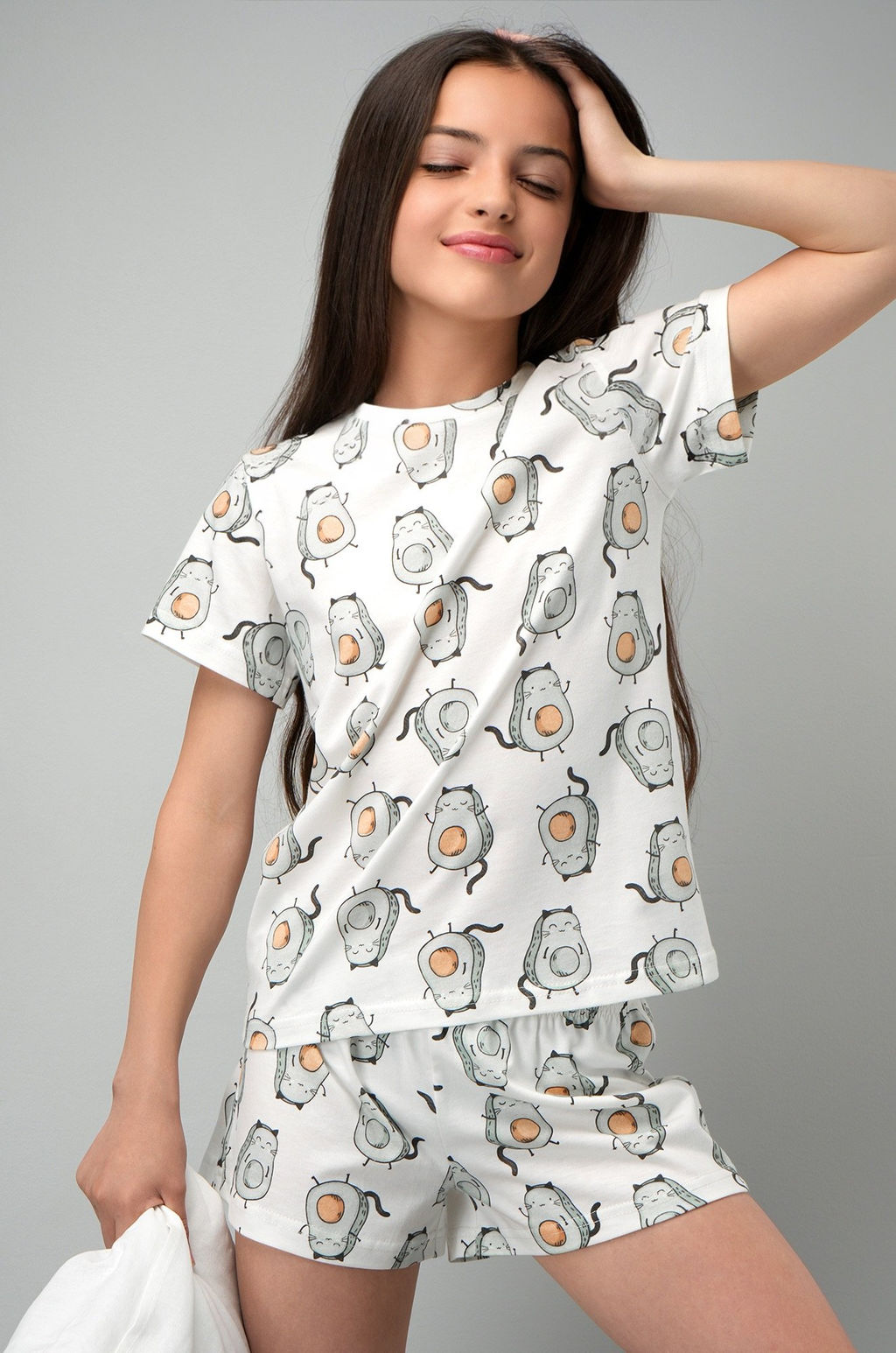 Состав: 100% хлопок Кулирная гладь . Страна: Россия. Милая и уютная, как лето пижама для девочки в молочном цвете с забавным принтом Авокадо. Хлопковая нежность и свобода движений в каждом элементе подросткового комплекта.