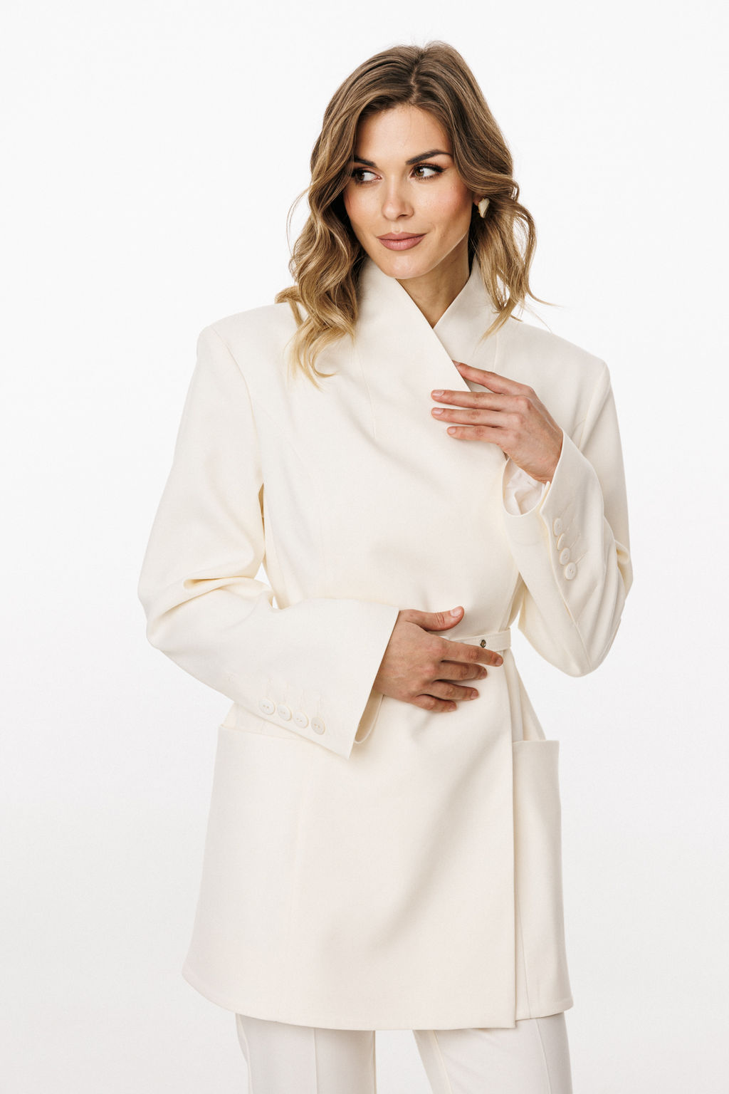 Жакет выполнен из костюмной ткани. Жакет К-образного силуэта, длиной ниже линии бедер. По переду обработаны рельефы от проймы до низа, талиевые вытачки, горизонтальные подрезы, переходящие на спинку, в которых обработаны карманы, двубортная застёжка на два ряда пришивных кнопок. На спинке обработаны две пары рельефов от проймы до низа. Жакет с плечевыми накладками, плечевой шов удлинен.