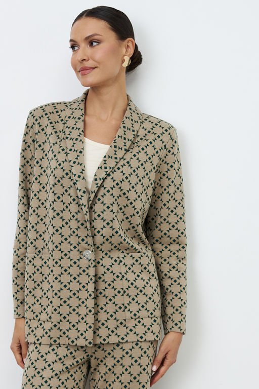 Жакет из эластичного полотна прямого свободного кроя с женственным шалевым воротником. На передней части изделия застежка на пуговицу и накладные карманы. Втачной рукав. Изделие с плечевыми накладками, которые при желании можно убрать.