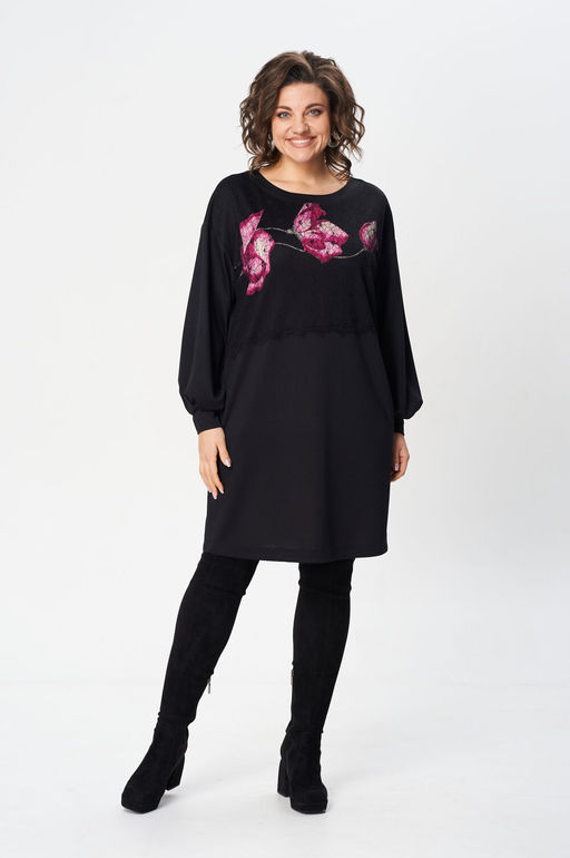 Платье свободного силуэта из трикотажной ткани с принтом. Рукав втачной одношовный со складками по низу и манжетой. В боковых швах карманы. Горловина обработана планкой в форме лодочки. По переду в в ерхней части настрочена сетка. Длина платья - 91 см , длина рукава платья - 53 см.­