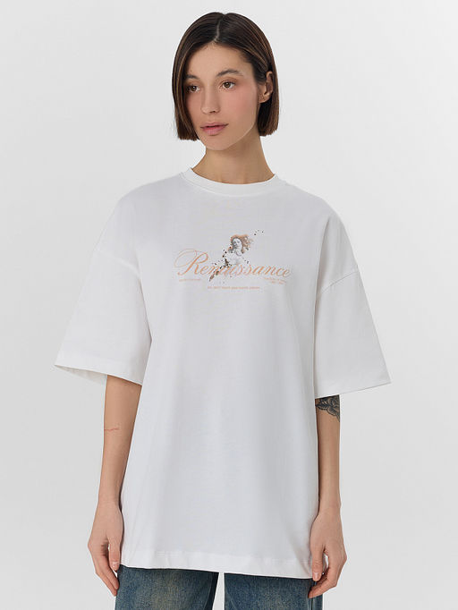 Белая женская футболка оверсайз с минималистичным принтом и надписью Ренессанс. Искусство, пожалуйста, не трогай руками это стильная и свободная модель для повседневной носки. Она выполнена из мягкого хлопкового трикотажа.