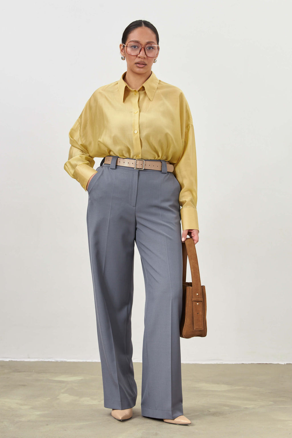 Прямые широкие брюки с карманами, на поясе комфортная резинка для лучшей посадки. Застежка на молнию и 2 пуговицы.­