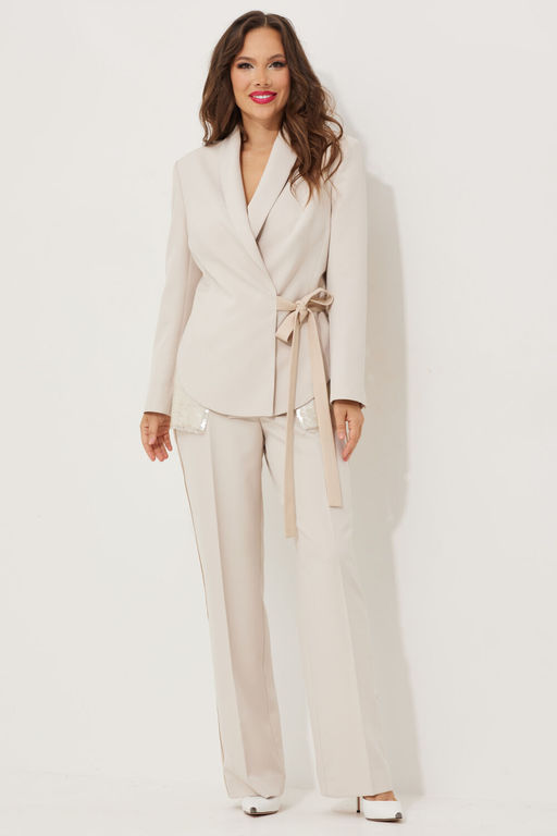 Стильный и элегантный комплект из жакета и брюк. Жакет полуприлегающего силуэта, на подкладке, с центральной застежкой на потайные кнопки. Так же жакет дополнен пришивным поясом. Рукав втачной. Воротник отложной. Спинка и отделочные элементы жакета и брюк выполнены из слегка мерцающей  поливискозной ткани, что придает комплекту неповторимый шарм. Так же жакет дополнен вставками из сетки с мерцающими пайетками. Брюки классического прямого кроя с притачным поясом, дополненным эластичной тесьмой. Застежка гульфик на молнию и пришивную пуговицу. По боковому шву, брюки дополнены пришивным элементом, выполненными из слегка мерцающей  поливискозной ткани. Длина жакета от плечевого шва 70 см. Длина рукава 60 см. Длина брюк по боковому шву 107 см­