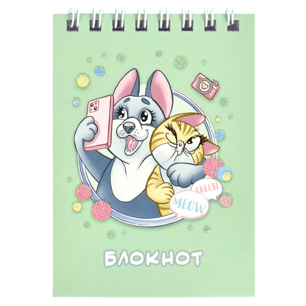 Блокнот, А7, 40 л, арт. 68157 СЕЛФИ / Блок - белый офсет 60 г/м?, клетка, гребень по короткой стороне, УФ-лак выборочный с глиттером,