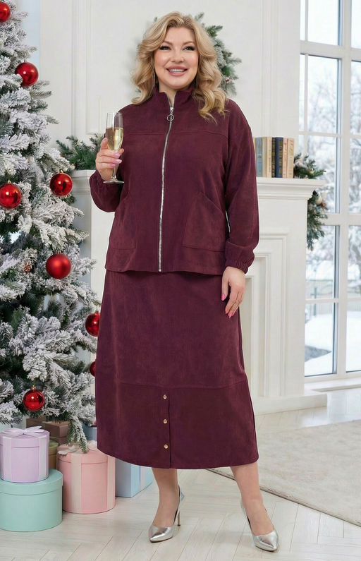 Костюм из мягкого микровельвета состоит из жакета и юбки. Материал хорошо сохраняет тепло, устойчив к деформации и практически не мнется.  Юбка отлично сидит за счет эластичной резинки на поясе. По переду модель украшена декоративными пуговками.