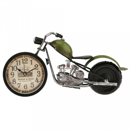 Часы настольные интерьерные "Мотоцикл" 30х8х15см, циферблат с рисунком, бежевый; цифры арабские, черный; фара - кристалл, корпус металл, черный матовый/зеленый; в коробке (Китай)
