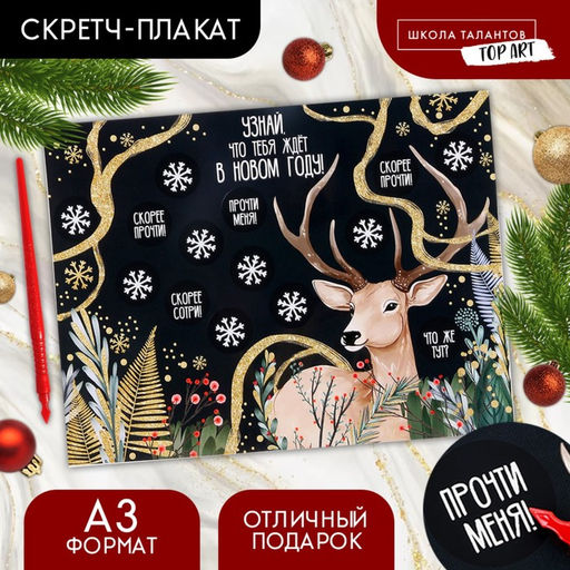 Новогоднее украшение. Скретч-плакат «Чудес в Новом году!» с клапаном, А3С помощью этого набора вы сможете с легкостью оформить интерьер любого помещения (офис, актовый зал, класс, холл), наполнив его яркими красками и новогодней атмосферой.Под каждым чёрным пятнышком скравается пожелание, предсказание или задание!Инструкция: отрежьте кусочек клейкой ленты ( в набор не входит) и приклейте декор, плотно прижав его на 2-3 секунды. Стирайте монетной чёрный скреч-слой и узнавайте что под ним пряталось! Для кого: Унисекс. Формат: А3. Возраст: От 3 лет. Символ года: Нет. Тематика праздника: Новый год. Вид гравюры: Гравюры-плакаты. Составляющие набора: Товары для творчества. Бесплатная доставка: Да. Наша разработка: Да. Размеры товара: 0.5/46.5/30.5.